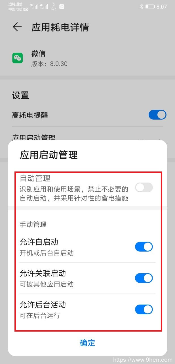 点击 设置-应用和服务-应用管理/应用启动管理-微信,按如下设置
